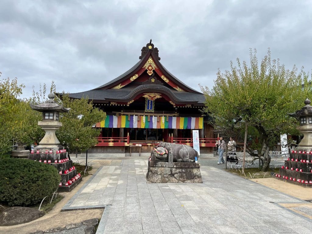 それでは本殿に参拝をしていきます。手前には撫で牛が鎮座しています。