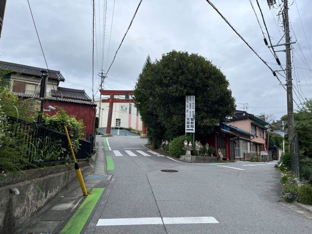 路地に入ってきました。おもったよりも閑静な住宅地といった感じで現時点では神社要素は全く感じませんね。道は若干上っています。ずっとまっすぐ進んでいきます。