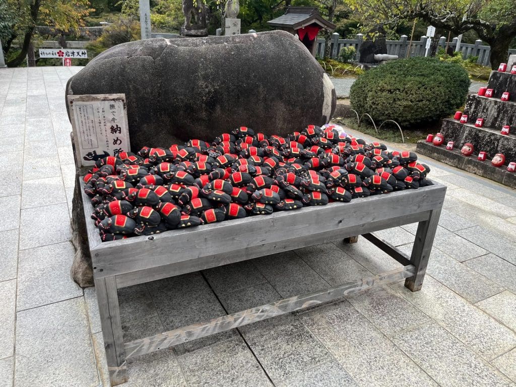ご自宅で願いを撫でながら願を掛け、心願成就した暁には、こちらに返却する形のようです。たくさんの願いを叶えてくださったことが伝わってきます。私も授与所で1体、願掛け撫で牛をお分かちいただきました。