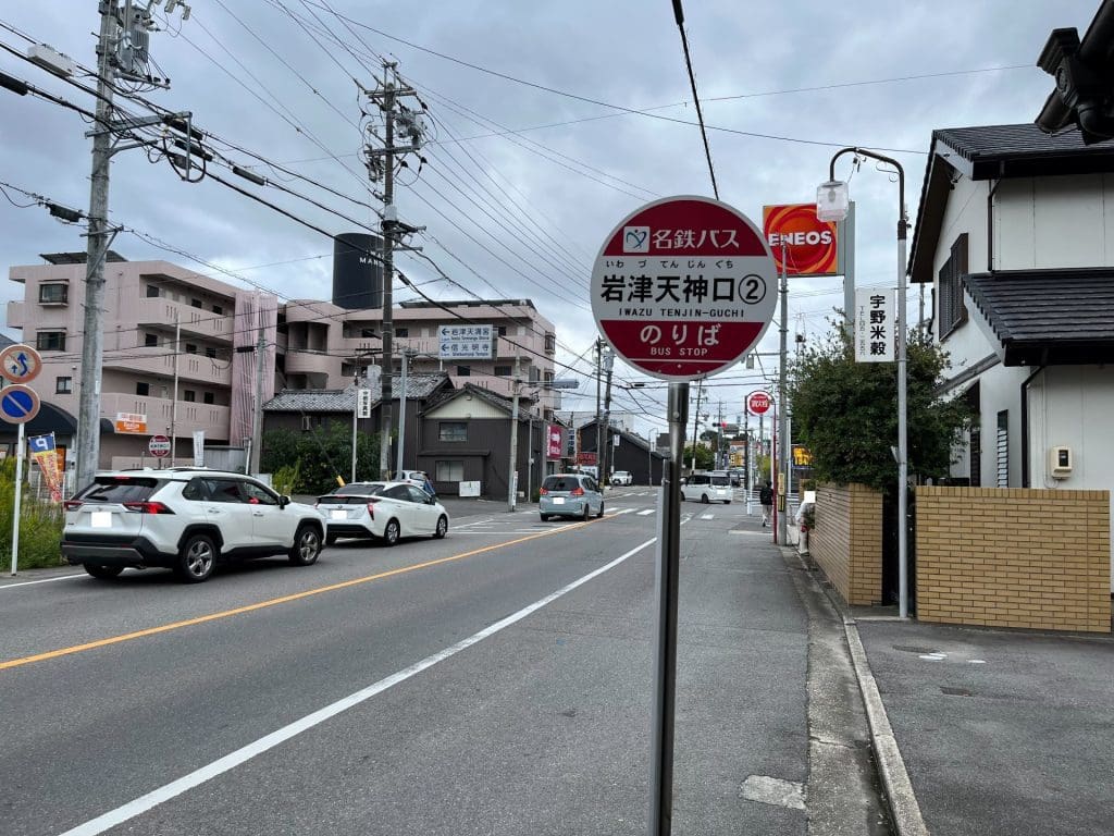 こちらが岩津天神口バス停です。訪問時点ではENEOSの少し向こうにファミリーマートがありました。一応コンビニも近くにありますので安心ですね!